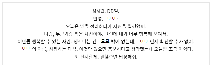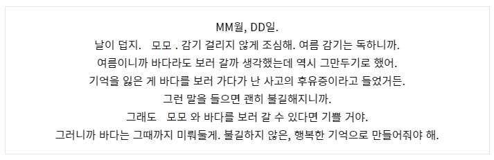 안녕, 모모. 처음으로 편지를 못 보냈네. 줄곧 매일 보냈었는데.