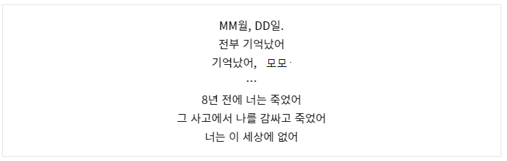 미안해, 편지를 쓸만한 상태가 아니었어. 모든 게 기억났어. 전부 기억해버렸어.